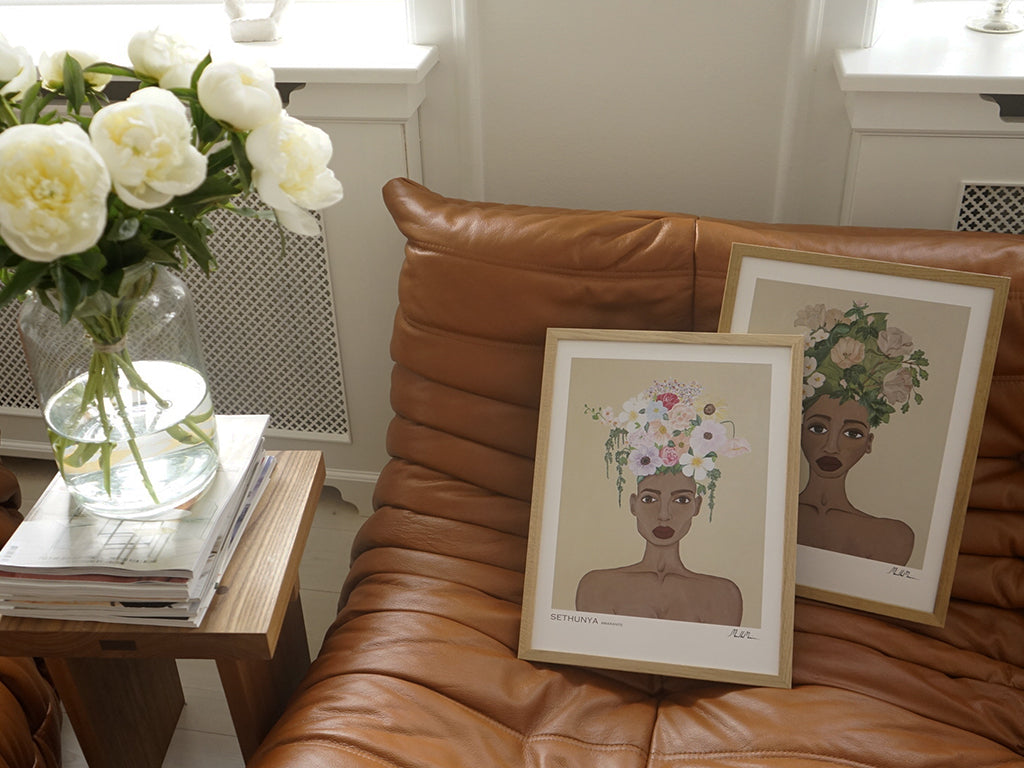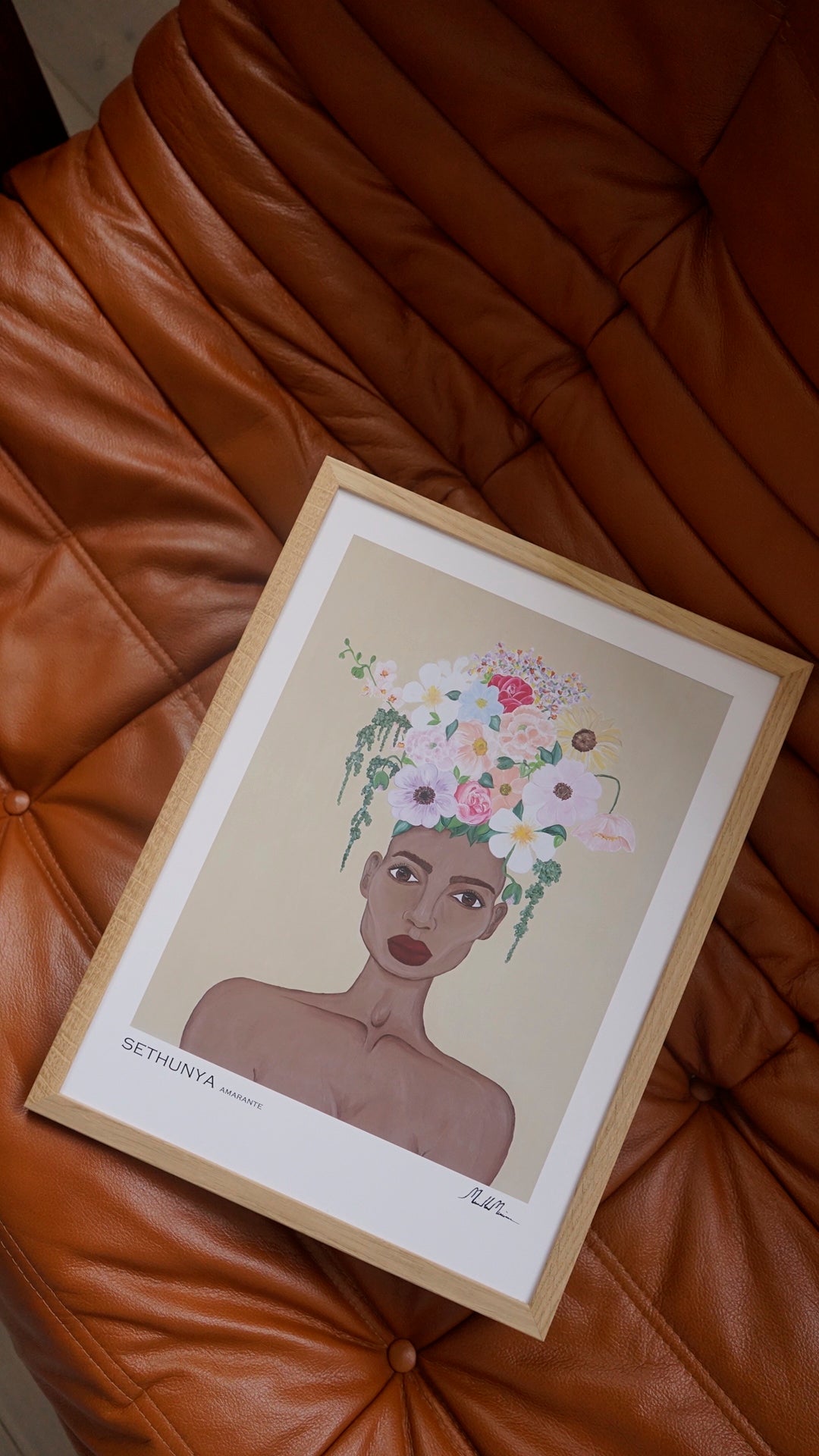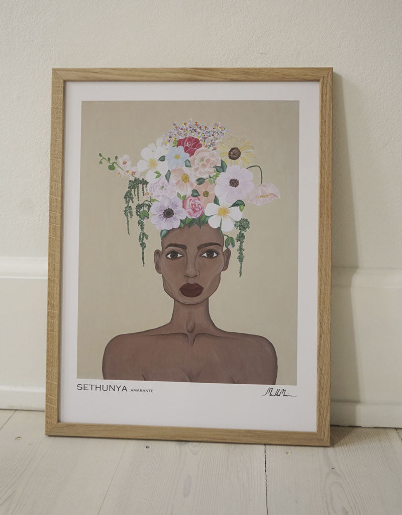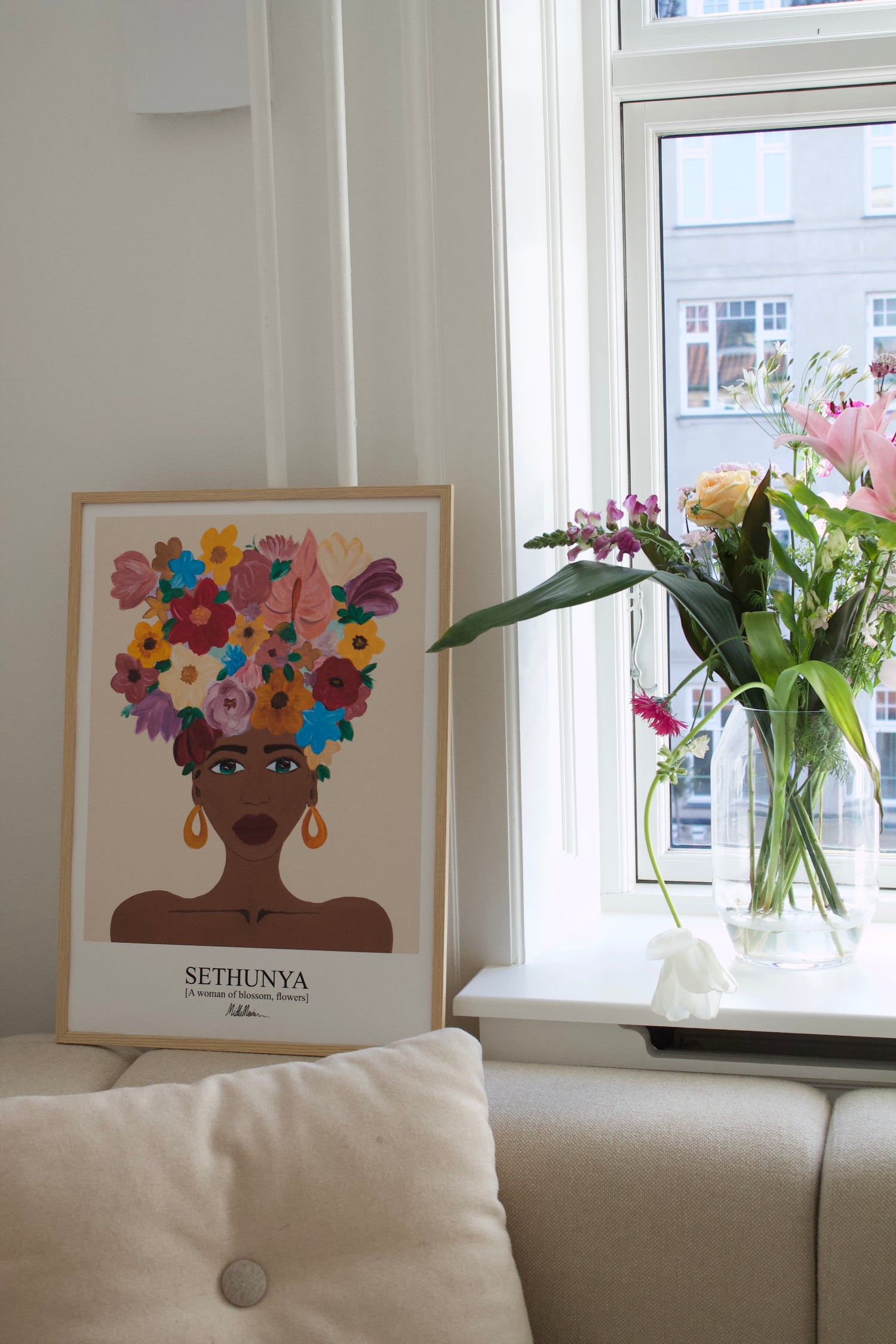 Plakaten er affotograferet af et større maleri. Sethunya kvinden er Morais Artworks’ bestseller, og kan fås med forskellige blomster og ansigtsudtryk. Kvinden har amaranthus og andre blomster i pastelnuancer. Sethunya kvindens navn betyder ”at blomstre, blomst”.